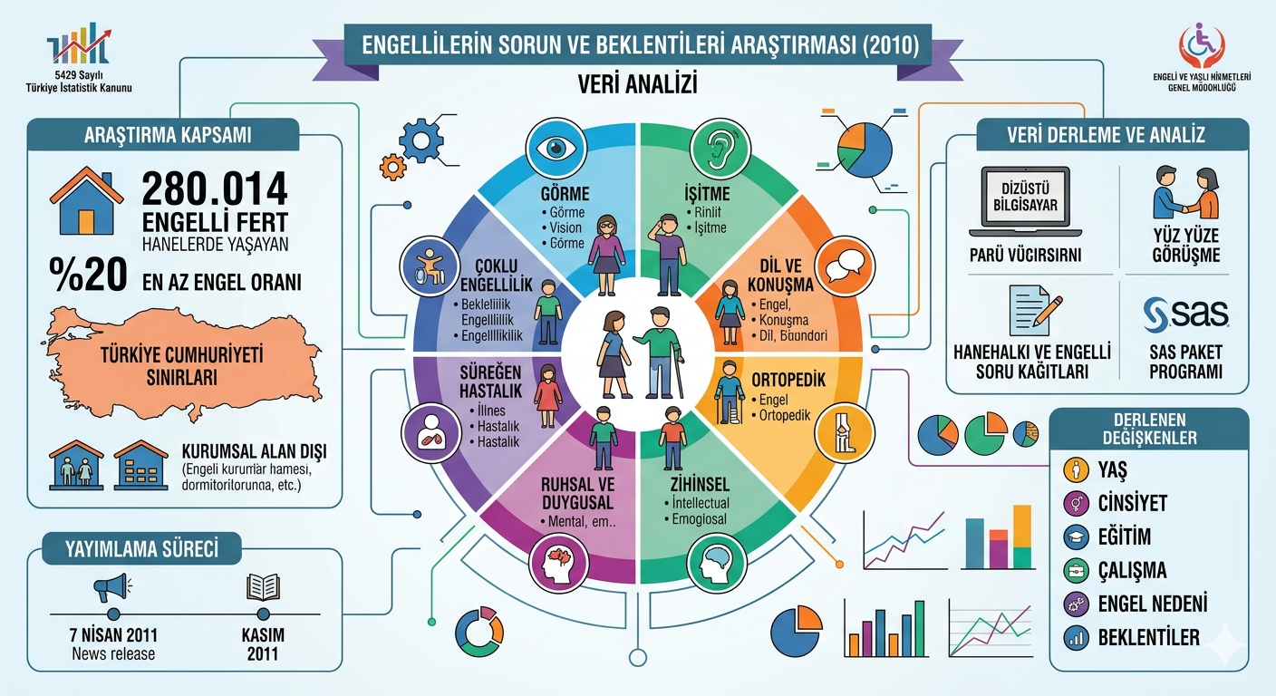 - Kapsam: Sağlık raporunda en az %20 engel oranına sahip olduğu bildirilen, Türkiye sınırları içerisindeki hanelerde yaşayan 280.014 engelli fert kapsama alındı.