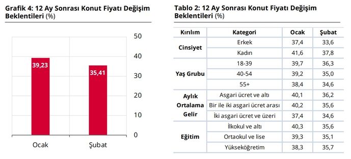 - Konut Fiyat Artış Beklentisi: Bir önceki aya göre 3,82 puan azalarak %35,41’e geriledi.