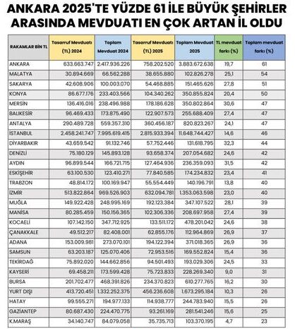 - Listenin Sonu: Mevduatı en az artan şehir ise %17 ile Kastamonu oldu (58 milyar liradan 68 milyar liraya çıktı).