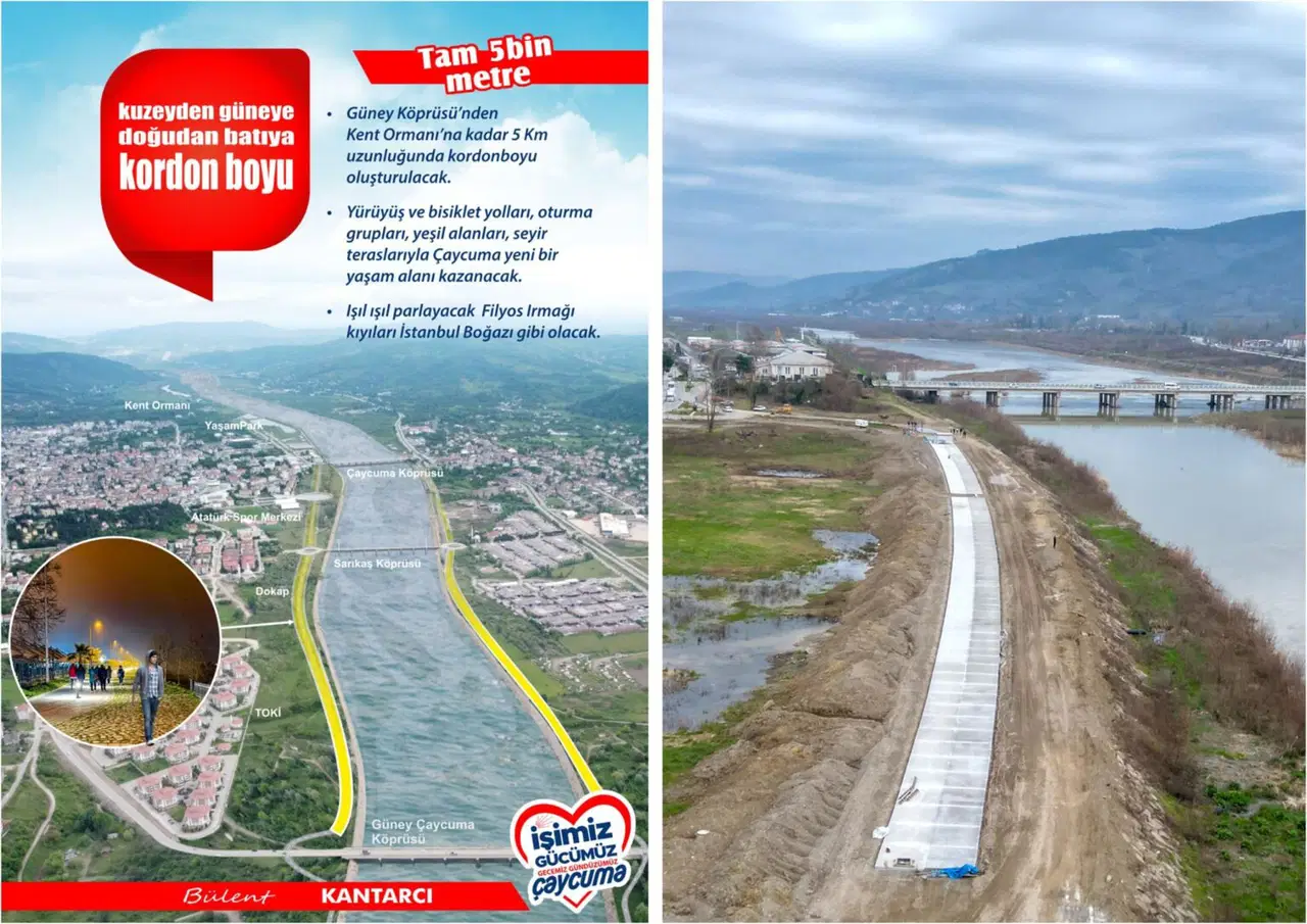 Zonguldak Çaycuma’yı Filyos Irmağı ile yeniden barıştırmayı hedefleyen dev rekreasyon projesinde ilk somut adım atıldı. 5 kilometre uzunluğundaki hattın tamamlanmasıyla kent, İstanbul Boğazı’nı aratmayacak bir görünüme kavuşacak.